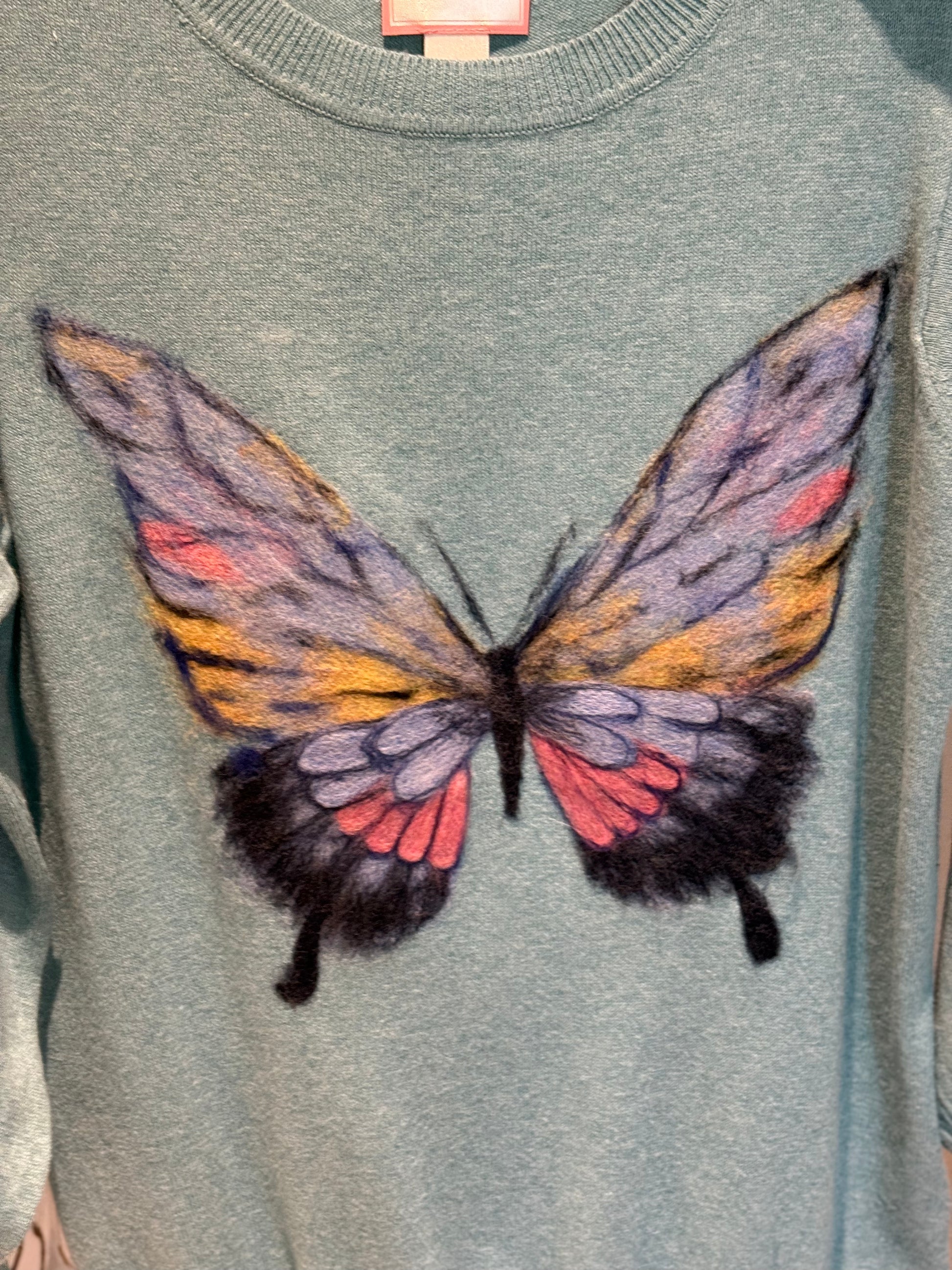 Aqua cashmere puff sleeve sweater with butterfly on the front