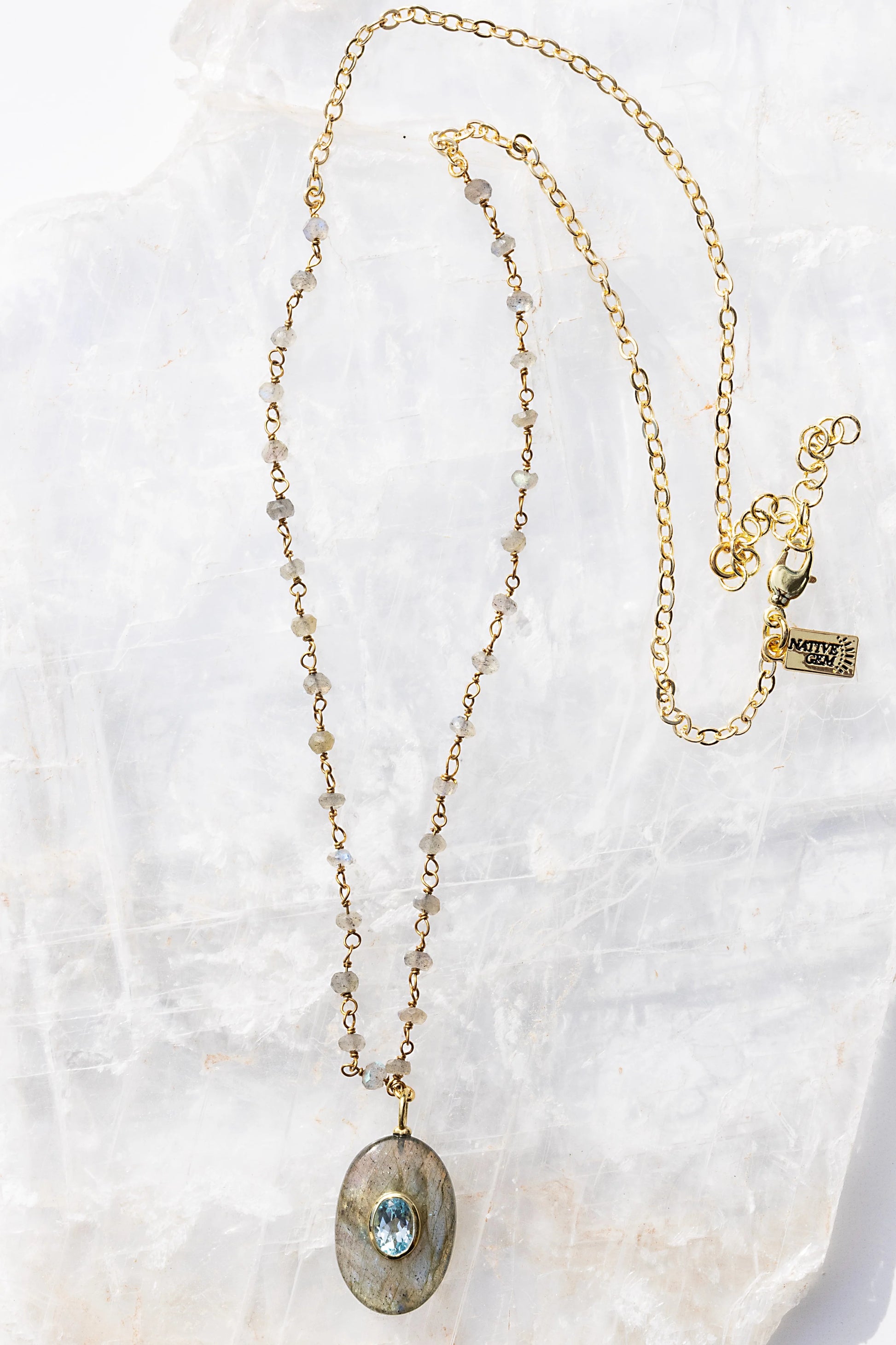 Ethereal and elegant, this 20-22” necklace showcases a mesmerizing labradorite gemstone, radiating flashes of iridescent blue and gold. A tiny faceted aqua CZ bezel adds a delicate shimmer, complementing the labradorite’s natural glow.