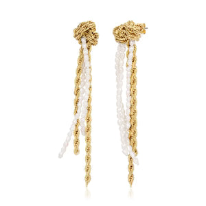 With cascading strands of gleaming gold chain and lustrous pearls, the Brittany Chain Pearl Drop Earrings create mesmerizing movement with every turn of your head.