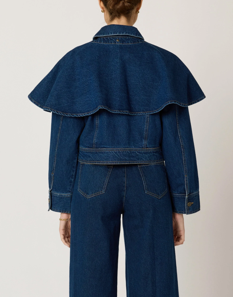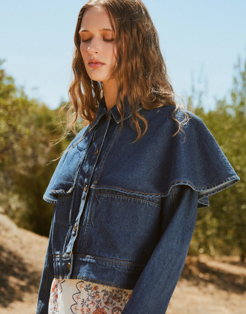 Crafted from 100% cotton, the Clarke Jacket is a versatile wardrobe staple with a unique twist. This long-sleeve, collared denim jacket features a button-down front, functional front pockets, and a removable cape detail that can be worn with or without—offering two looks in one. Effortlessly cool and endlessly layerable.