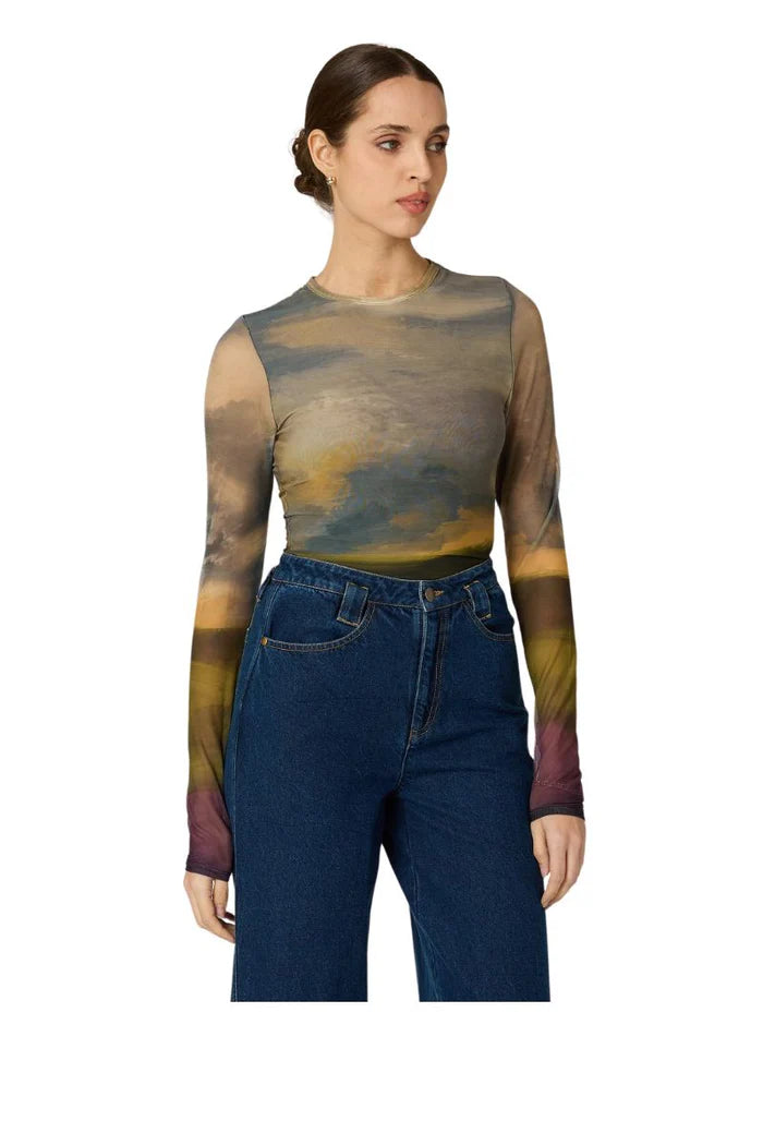 This fitted mesh long-sleeve top features a one-of-a-kind hand-painted design, blending artful detail with modern versatility. Style it with denim for an everyday look or layer it under a blazer for an elevated edge.