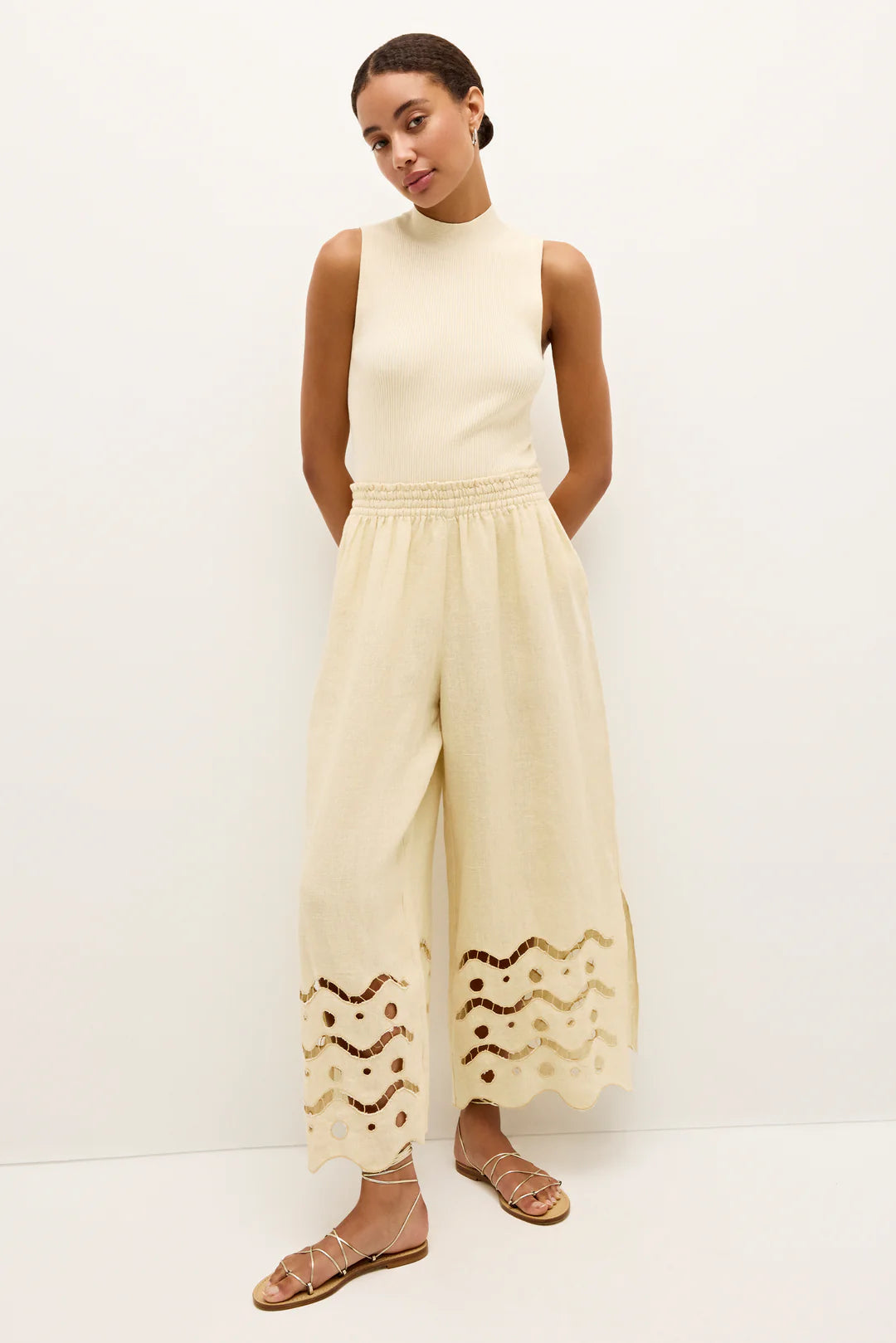 Effortless and easy, the Eyelet Pant in Birch embodies breezy summer elegance. Crafted from a breathable cotton/flax blend with embroidered hem, this relaxed silhouette features a wide leg with subtle side slits for graceful movement. The smocked elastic waistband ensures a pull-on fit that sits comfortably at the natural waist.
