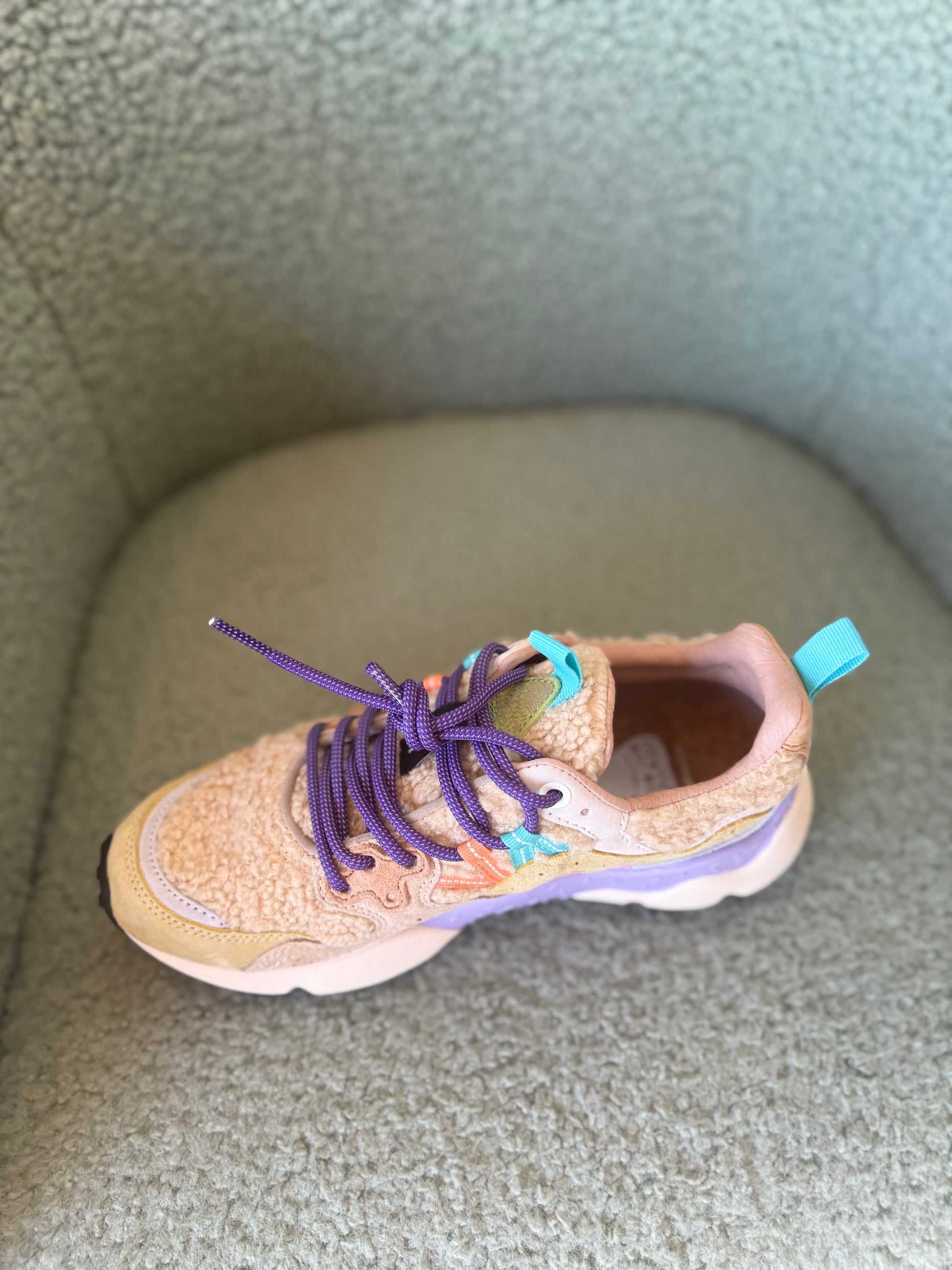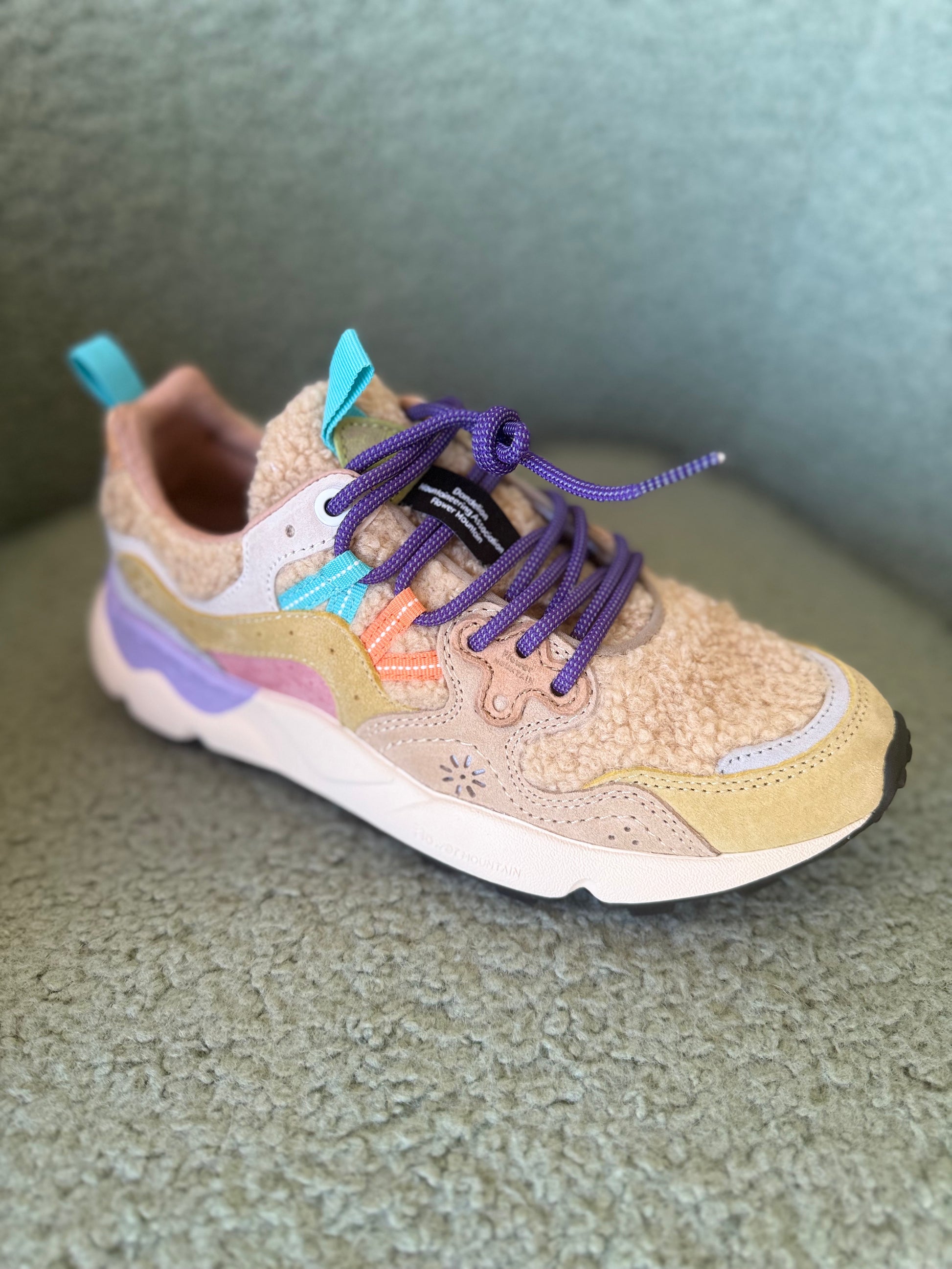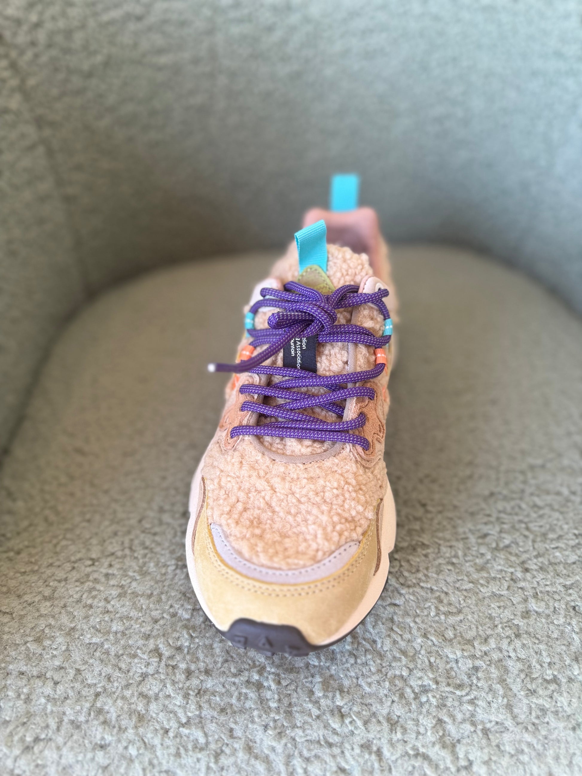 Sneaker in technical fabric & teddy with multi-coloured suede inserts. Reinforced eyelets and trek laces. Antibacterial natural cork insole.