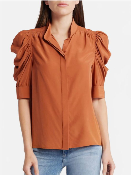 At once modern and romantic, this silk blouse has become a FRAME favorite. Featuring a high neckline and boldly puffed sleeves with ruched detailing, it easily complements any of your denim. Color Rust