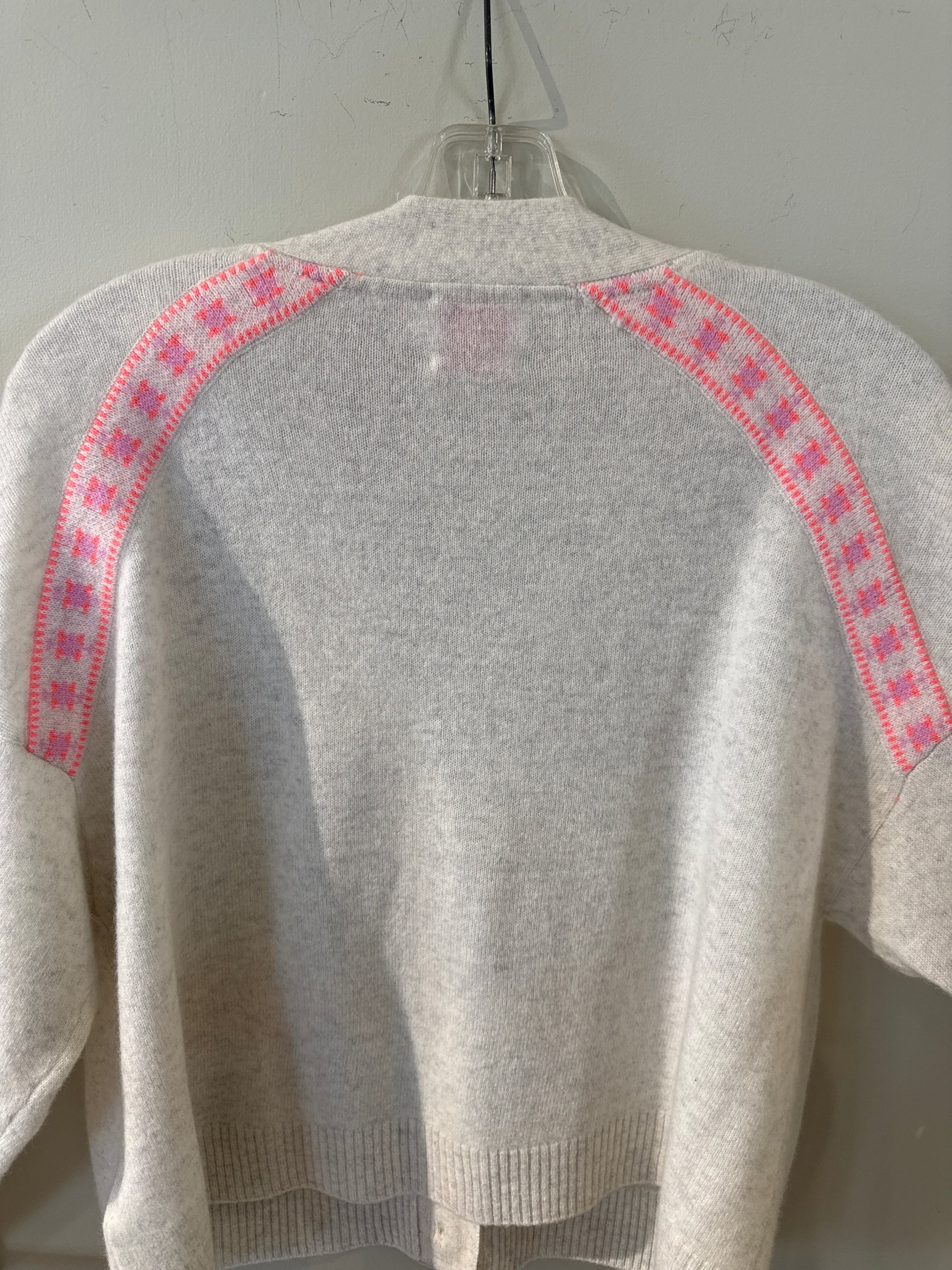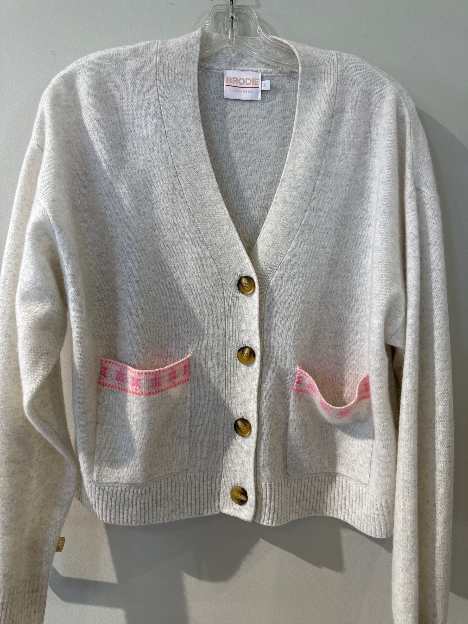 Brodie Cashmere cardigan with neon geometric details on pockets and back.
