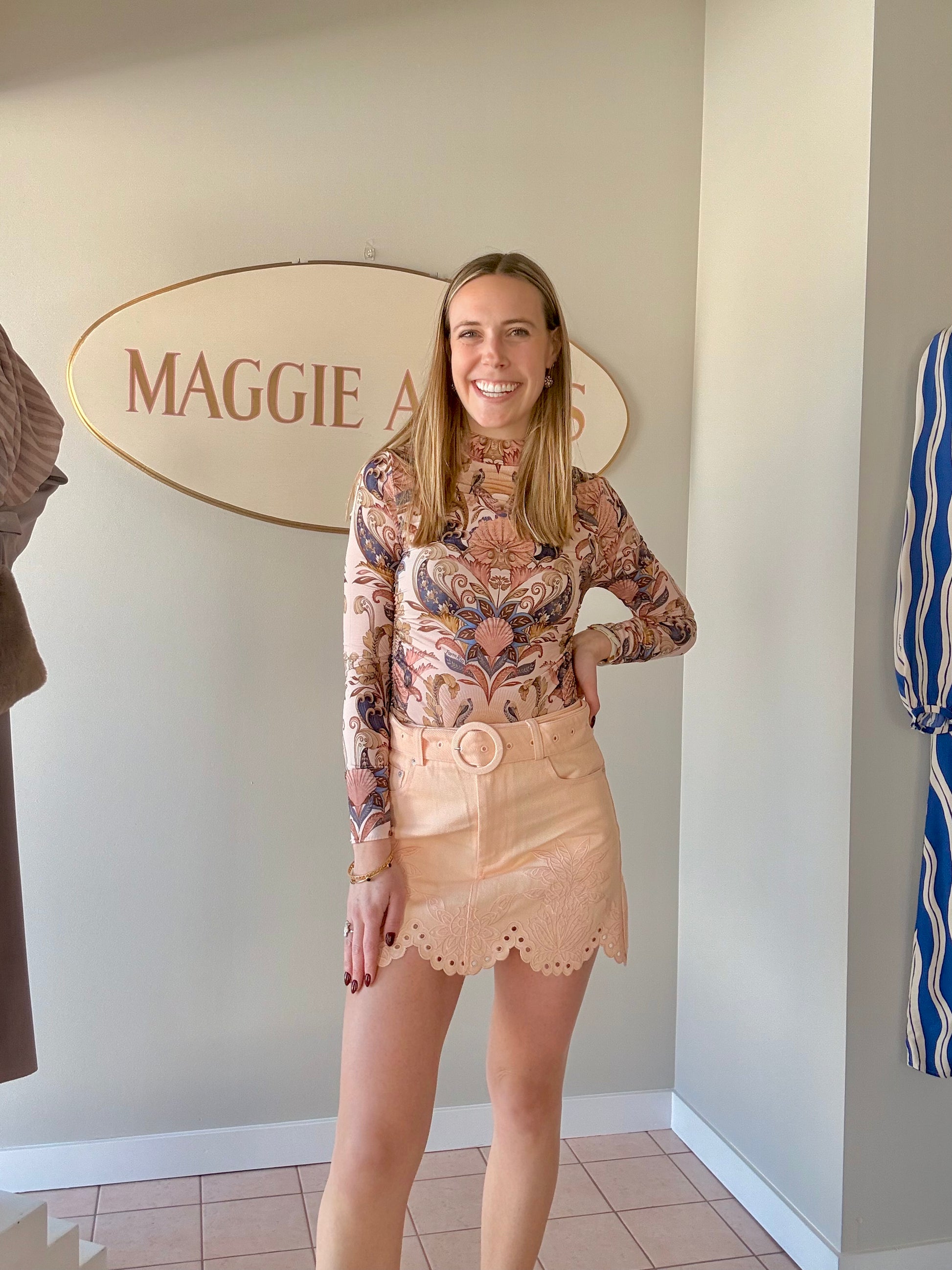 Pink skirt with belt.