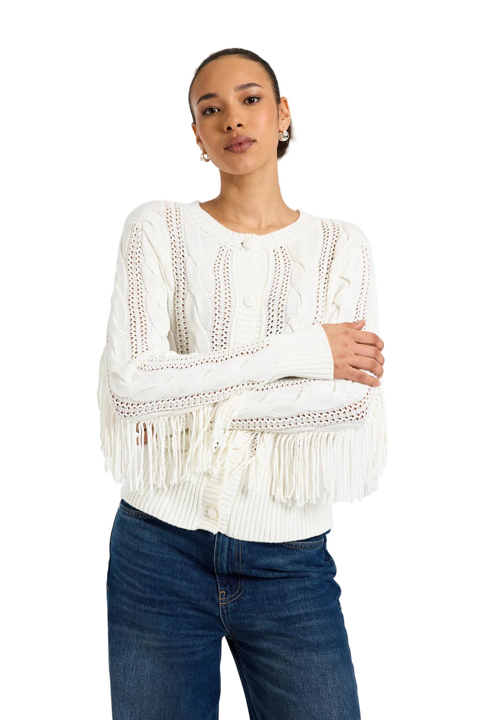 Ivory fringe crew sweater. 100% cotton