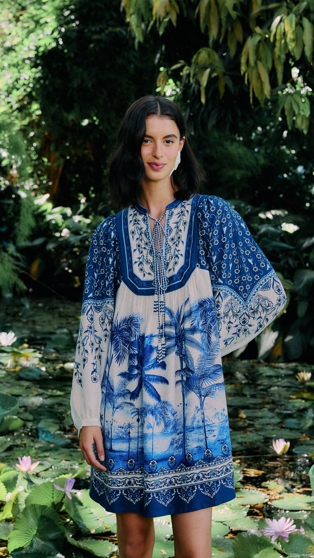 Embrace the essence of tropical beauty with the Off-White Palm Tree Beach Dress. Crafted from responsible materials, this delightful piece showcases intricate palm tree patterns in serene blues and whites.