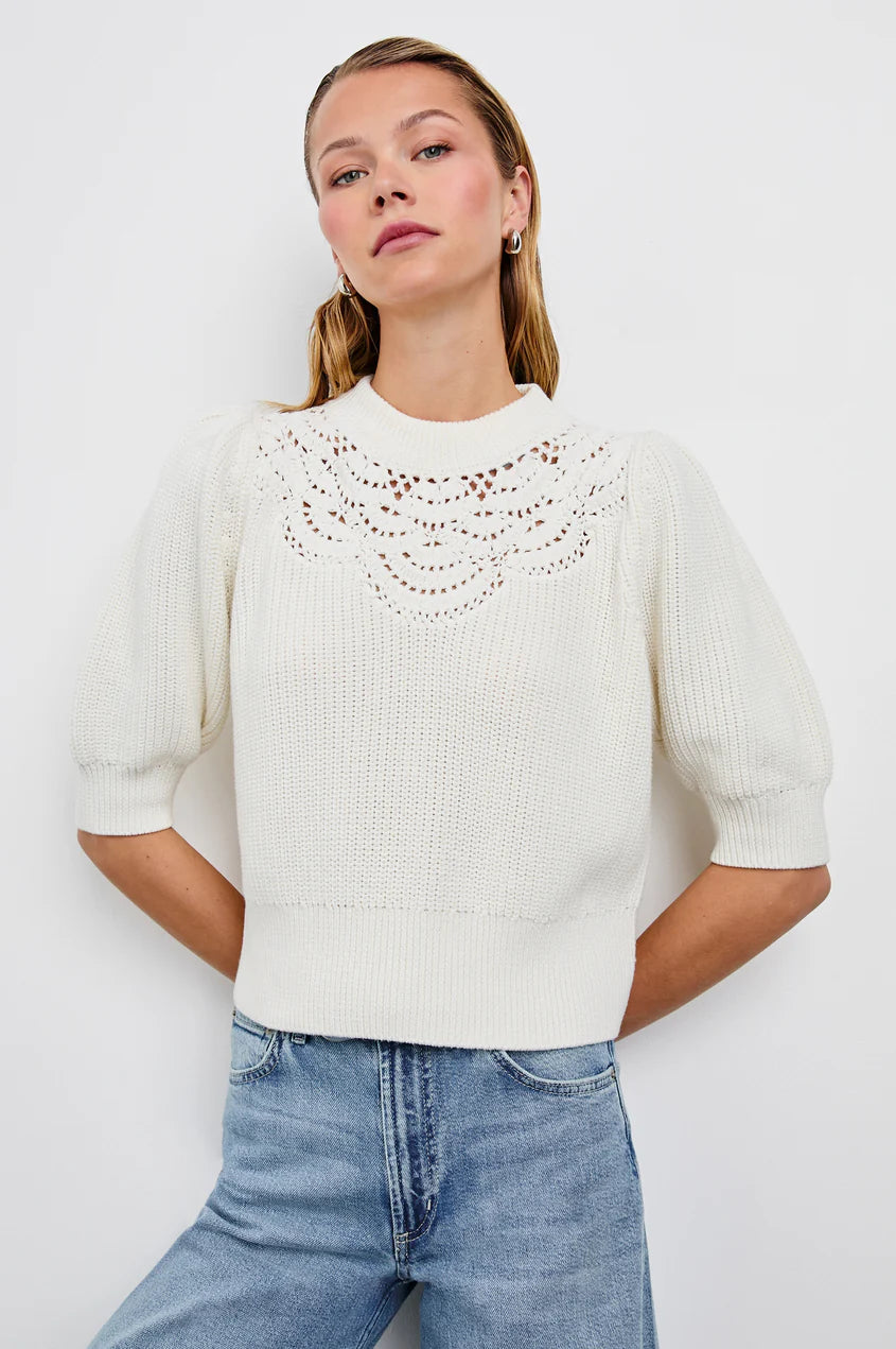 The Steph blends blouse, sweater, and tee for the ultimate transitional top in a cotton knit fabrication. It features a crew body with crochet at the neckline, and has a mid-weight feel that works year-round.