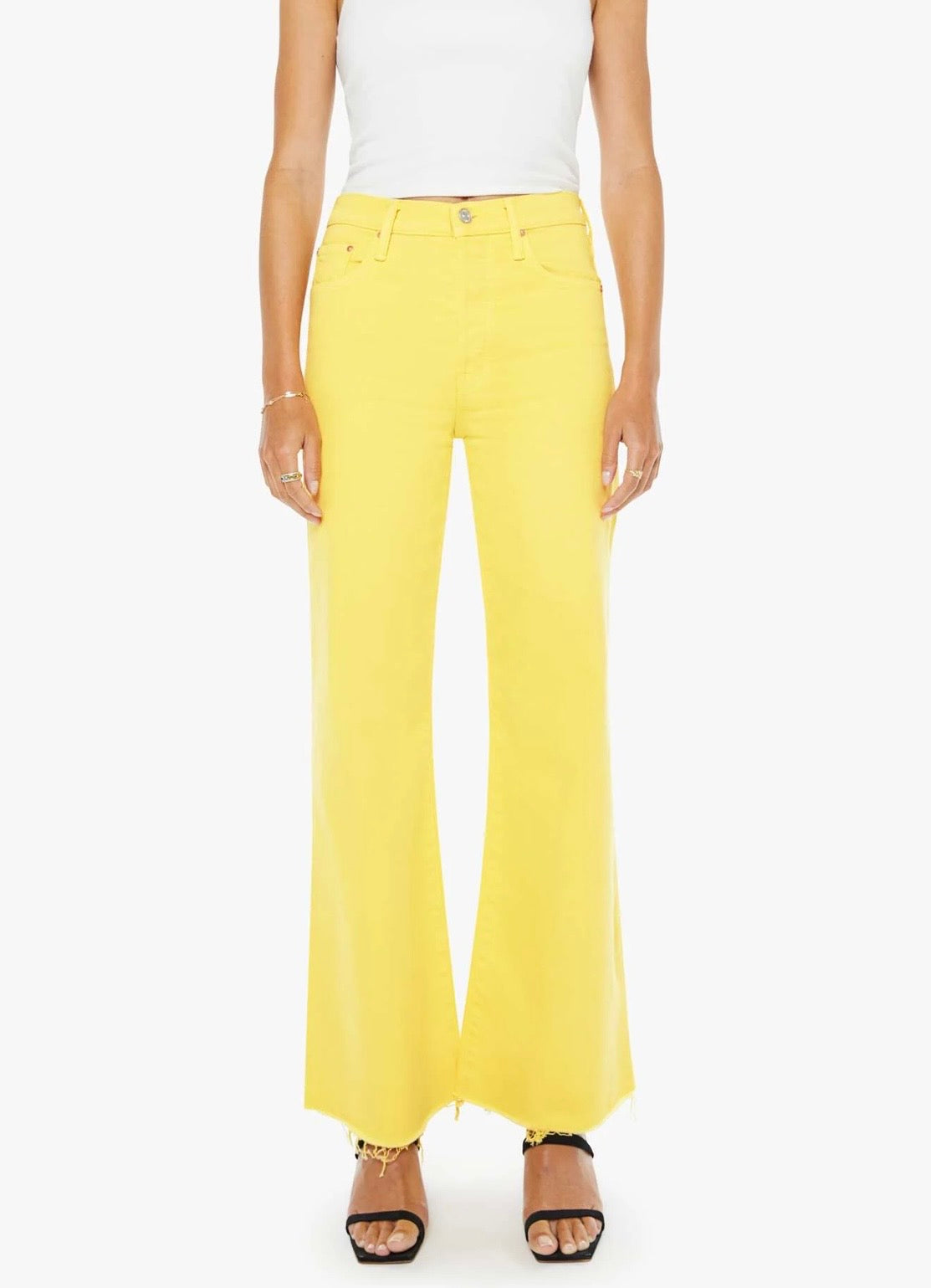 Sunny side up. High-waisted wide-leg jeans with a button fly, 31-inch inseam and a frayed hem. Made from rigid SUPERIOR denim, Sunshine is a bright yellow with subtle fading at the knees.